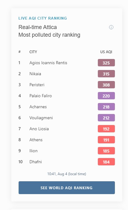 Το iqair.com μάλιστα έχει και μία λίστα με τις 10 περιοχές της Αττικής που παρουσιάζουν τα υψηλότερα επίπεδα μόλυνσης του αέρα και η οποία ανανεώνεται κάθε λίγα λεπτά. Σύμφωνα με το in.gr πριν από λίγη ώρα έδινε τα εξής αποτελέσματα: