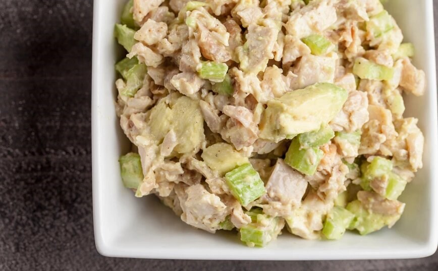 Προσθέστε το κρεμμύδι, το σέλινο, την καυτερή πιπεριά χαλαπένιο και το κοτόπουλο στο μείγμα με το αβοκάντο και ανακατέψτε καλά.