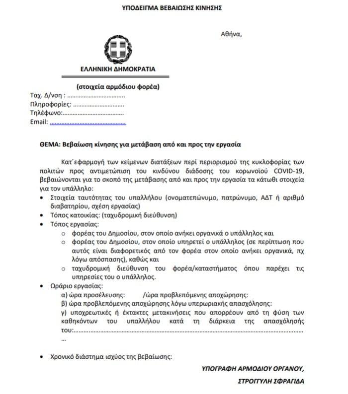 Ο μετακινούμενος υπάλληλος οφείλει να φέρει υποχρεωτικά μαζί του την αστυνομική του ταυτότητα ή διαβατήριο, καθώς και τη βεβαίωση κίνησης, σε έντυπη ή σε ηλεκτρονική μορφή».