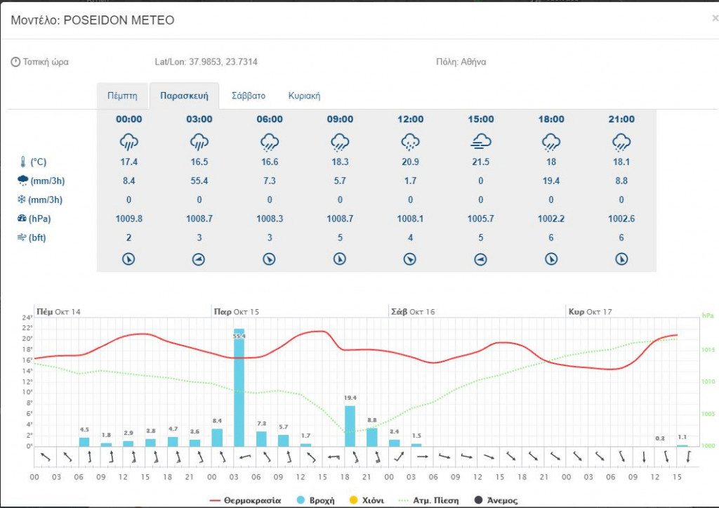 Σύμφωνα με την πρόγνωση, όλη την Πέμπτη, όπου στην Αττική έγινε κυριολεκτικά χαμός με τις βροχοπτώσεις, δεν ξεπέρασαν αυτές τα 5 mm ανά τρεις ώρες. Στις 12 τα μεσάνυχτα αυτό το νούμερο ανεβαίνει στα 8,4 mm ανά 3 ώρες για να «απογειωθεί» στα 55,4 mm ανά 3 ώρες στις 3 τα ξημερώματα.