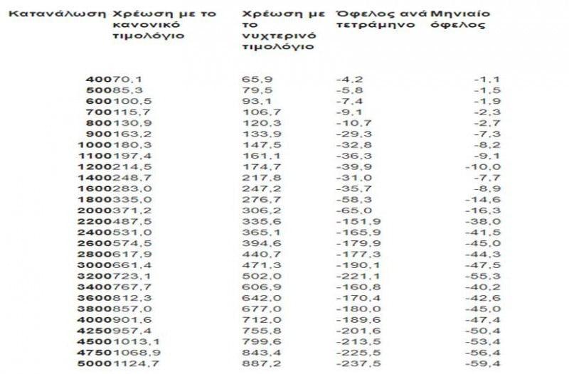 • Για τον υπολογισμό του κόστους με το νυχτερινό τιμολόγιο, ελήφθη υπόψη ότι ο καταναλωτής θα καταφέρει να μεταφέρει στο «νυχτερινό» το 40% της συνολικής κατανάλωσης.
