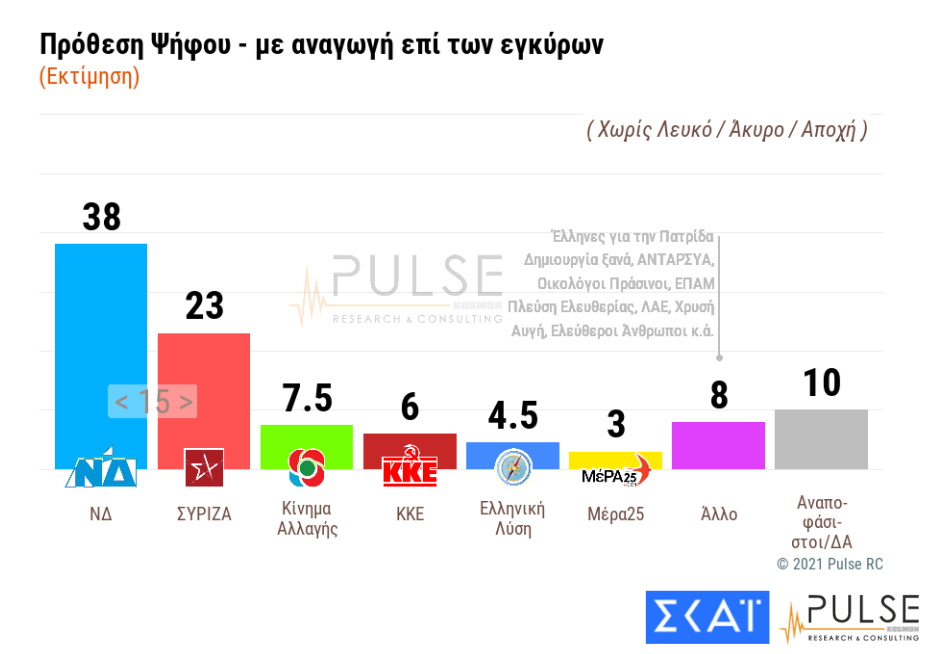 Στην πρόθεση ψήφου με αναγωγή επί των εγκύρων, η ΝΔ παίρνει προβάδισμα 15 μονάδων, με 38% έναντι 23% για το κόμμα της αξιωματικής αντιπολίτευσης.