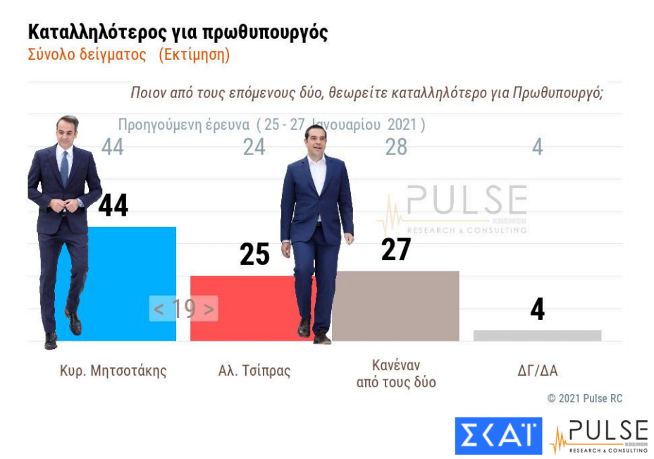 Στην ίδια δημοσκόπηση, ο Κυριάκος Μητσοτάκης χαίρει της εκτίμησης του 44% των ερωτηθέντων αναφορικά με την καταλληλότητα για πρωθυπουργός, με τον Αλέξη Τσίπρα να ακολουθεί με ποσοστό 25%.