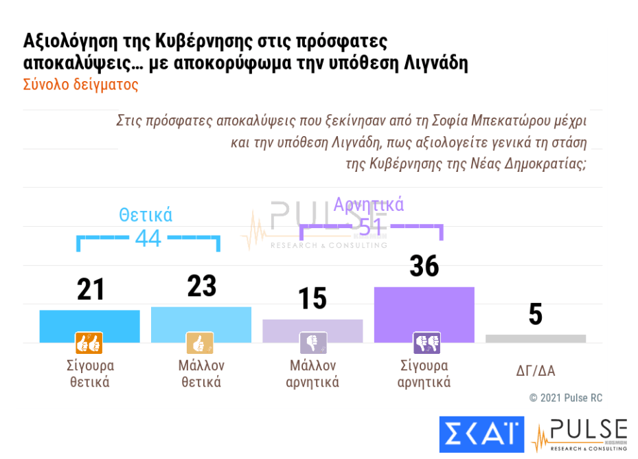 Στην ερώτηση πώς αξιολογείται τη στάση της κυβέρνησης της Νέας Δημοκρατίας στις αποκαλύψεις από τη Σοφία Μπεκατώρου μέχρι την υπόθεση Λιγνάδη, το 51% απαντά αρνητικά, ενώ το 44% εκτιμά πως ήταν θετική η αντίδραση.