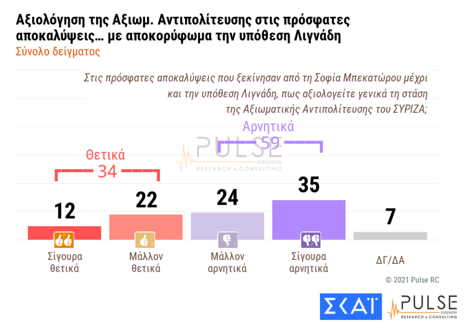 Αντίστοιχα, ωστόσο, η δημοσκόπηση εκτιμά αρνητικά σε ποσοστό 59% και τους χειρισμούς του ΣΥΡΙΖΑ στην ίδια υπόθεση, με το ποσοστό θετικών κρίσεων να υπολογίζεται στο 34%.