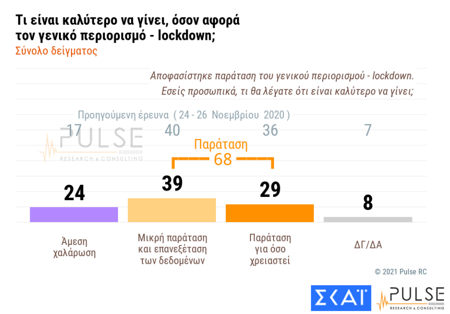 Στο ίδιο θέμα και με δεδομένη την επιδείνωση της επιδημιολογικής εικόνας στη χώρα, φαίνεται πως το 68% των ερωτηθέντων στη δημοσκόπηση τάσεται υπέρ της παράτασης του lockdown, όπως αποφασίστηκε από την κυβέρνηση, ενώ το 24% ζητεί άμεση χαλάρωση των μέτρων.