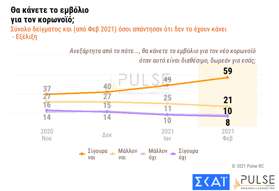 Διαχρονικά, φαίνεται πως το ποσοστό των ερωτηθέντων στην ίδια δημοσκόπηση που δηλώνει πως θα κάνει το εμβόλιο κατά του κορωνοϊού αυξήθηκε από το 37% (σίγουρα ναι) τον Νοέμβριο στο 59% σήμερα.