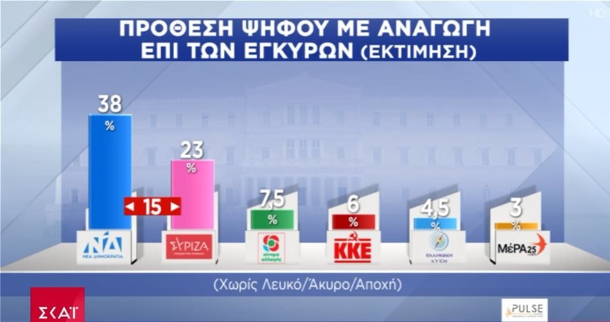 Στις 15 μονάδες υπολογίζεται η διαφορά μεταξύ Νέας Δημοκρατίας και ΣΥΡΙΖΑ σε νέα δημοσκόπηση της Pulse για λογαριασμό του ΣΚΑΪ.