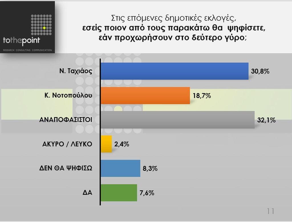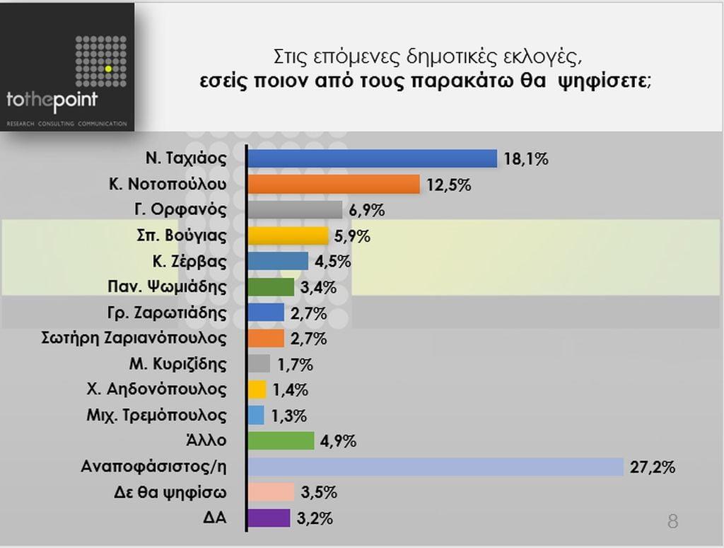 Στην ερώτηση «Ποιον θα ψηφίζατε στις επόμενες δημοτικές εκλογές», ποσοστό 18,1% απάντησε ότι θα ψήφιζε τον Νίκο Ταχιάο, ενώ το 12,5% των ερωτώμενων την Κατερίνα Νοτοπούλου, και ακολουθούν ο Γ. Ορφανός (6,9%), ο Σπ. Βούγιας (5,9%) και ο Κων. Ζέρβας (4,5%). Σημαντικό είναι το ποσοστό που δηλώνει αναποφάσιστο, καθώς περίπου οι 30 στους 100 απάντησαν ότι δεν έχουν αποφασίσει. Όσον αφορά την προέλευση των ψηφοφόρων, τα μεγαλύτερα ποσοστά των ερωτώμενων που στις εθνικές εκλογές του 2015 είχαν ψηφίσει Ένωση Κεντρώων (47,9%) καθώς και αυτών που είχαν ψηφίσει ΑΝΕΛ (41,4%) θα στηρίξουν τον Νίκο Ταχιάο, ενώ την Κατερίνα Νοτοπούλου δηλώνουν ότι θα ψηφίσουν το 15% όσων είχαν ψηφίσει ΣΥΡΙΖΑ, το 29% όσων είχαν ψηφίσει ΑΝΕΛ, αλλά και το 14,6% όσων είχαν ψηφίσει ΝΔ.