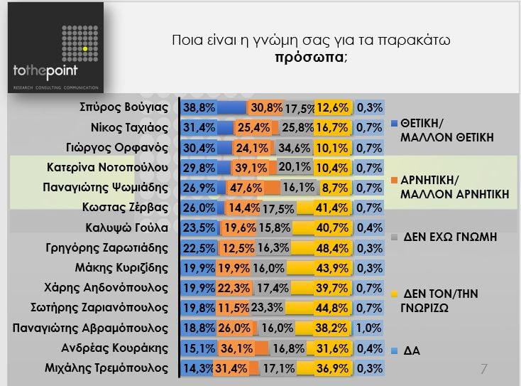 Ενδιαφέροντα είναι τα ποσοστά θετικής ή αρνητικής γνώμης των ερωτώμενων για τα πρόσωπα, καθώς την πιο θετική γνώμη συγκεντρώνει ο Σπύρος Βούγιας με ποσοστό 38,8%, για τον οποίο μεγάλο είναι και το ποσοστό αρνητικής γνώμης καθώς αγγίζει το 30,85. Στη θετική γνώμη ακολουθούν με πολύ μικρές διαφορές οι Ταχιάος, Ορφανός, Νοτοπούλου με ποσοστά 31,4%, 30,4% και 29,8% αντίστοιχα. Ωστόσο για την Κατερίνα Νοτοπούλου οι αρνητικές (39,1%) γνώμες ξεπερνούν τις θετικές, ενώ περισσότερο αρνητική με ποσοστό 47,6% είναι η γνώμη των ερωτώμενων για τον Παναγιώτη Ψωμιάδη. Οι Κων. Ζέρβας, Κ. Γούλα και Γρ. Ζαρωτιάδης συγκεντρώνουν πιο πολλές θετικές από αρνητικές γνώμες, ενώ απόλυτη ισορροπία εμφανίζει ο Μ. Κυριζίδης. Το πρόσωπο που δεν είναι και τόσο δημοφιλές είναι ο Γρ. Ζαρωτιάδης, καθώς ποσοστό 48,4% απάντησε ότι δεν τον γνωρίζει, ενώ και οι Ζαριανόπουλος, Ζέρβας και Κυριζίδης δεν συγκεντρώνουν υψηλά ποσοστά αναγνωρισιμότητας.