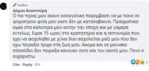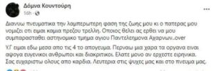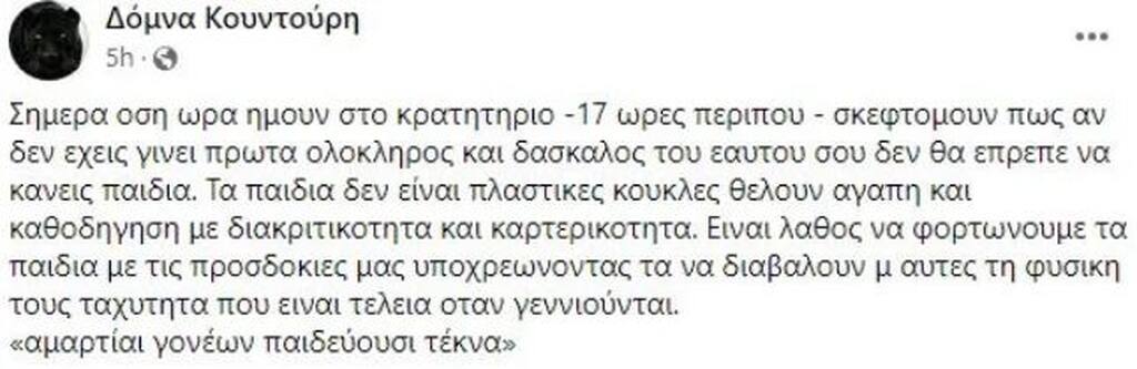 Και συνέχεια σε νέο της μήνυμα ανέφερε: «Σήμερα όση ώρα ήμουν στο κρατητήριο -17 ώρες περίπου – σκεπτόμουν πως αν δεν έχεις γίνει πρώτα ολόκληρος και δάσκαλος του εαυτού σου δεν θα έπρεπε να κάνεις παιδιά. Τα παιδιά δεν είναι πλαστικές κούκλες, θέλουν αγάπη και καθοδήγηση με διακριτικότητα και καρτερικότητα. Είναι λάθος να φορτώνουμε τα παιδιά με τις προσδοκίες μας υποχρεώνοντας τα να διαβάλλουν μ’ αυτές τη φυσική τους ταχύτητα που είναι τέλεια όταν γεννιούνται. “αμαρτίαι γονέων παιδεύουσι τέκνα”».