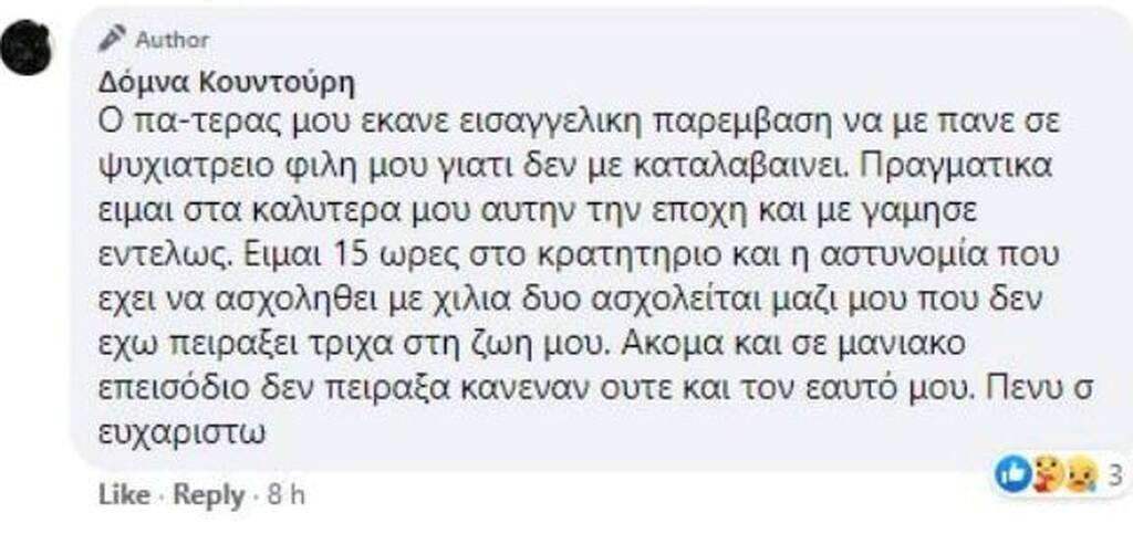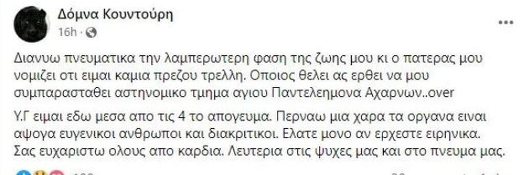 Συγκεκριμένα έγραψε στον προσωπικό της λογαριασμό στο facebook: «Διανύω πνευματικά τη λαμπερότερη φάση της ζωής μου κι ο πατέρας μου νομίζει ότι είμαι καμιά πρεζου τρελή. Όποιος θέλει ας έρθει να μου συμπαρασταθεί αστυνομικό τμήμα Αγίου Παντελεήμονα Αχαρνων..over Υ.Γ είμαι εδω μέσα από τις 4 το απόγευμα. Περνάω μια χαρά τα όργανα είναι άψογα, ευγενικοί άνθρωποι και διακριτικοί. Ελάτε μόνο αν έρχεστε ειρηνικά. Σας ευχαριστώ όλους από καρδιάς. Λευτεριά στις ψυχές μας και στο πνεύμα μας».