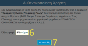 8. Θα εμφανιστούν το όνομα, το επώνυμο και το ΑΦΜ σας. Εφόσον είναι σωστά τα στοιχεία, πατήστε την επιλογή «Συνέχεια».