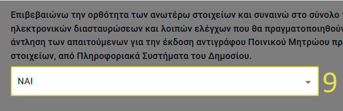 9. Κάτω από τα προσωπικά στοιχεία σας θα χρειαστεί να τα επιβεβαιώσετε και να συναινέσετε στη διαδικασία έκδοσης του αντίγραφου ποινικού μητρώου σας. Πατήστε εντός του λευκού πεδίου και επιλέξτε «ΝΑΙ».