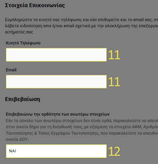 11. Κάτω από τις προσωπικές πληροφορίες σας θα υπάρχουν δύο πεδία «Κινητό Τηλέφωνο» και «Email». Πρέπει να πληκτρολογήσετε τουλάχιστον ένα από τα δύο (αν θέλετε και τα δύο), ώστε να ειδοποιηθείτε στο κινητό τηλέφωνο ή/και στο email σας για την έκδοση του αντίγραφου ποινικού μητρώου σας.