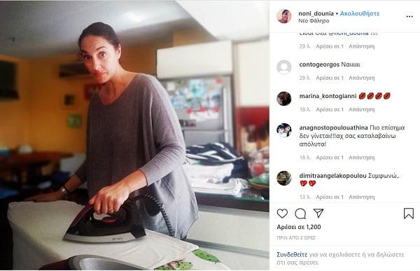 Συγκεκριμένα, η κ. Δούνια ανέβασε φωτογραφία της ενώ βρίσκεται στο σπίτι της και σιδερώνει. Συνόδευσε δε τη φωτογραφία με το ακόλουθο κείμενο: «Επίσημα η χειρότερη δουλειά του νοικοκυριού».
