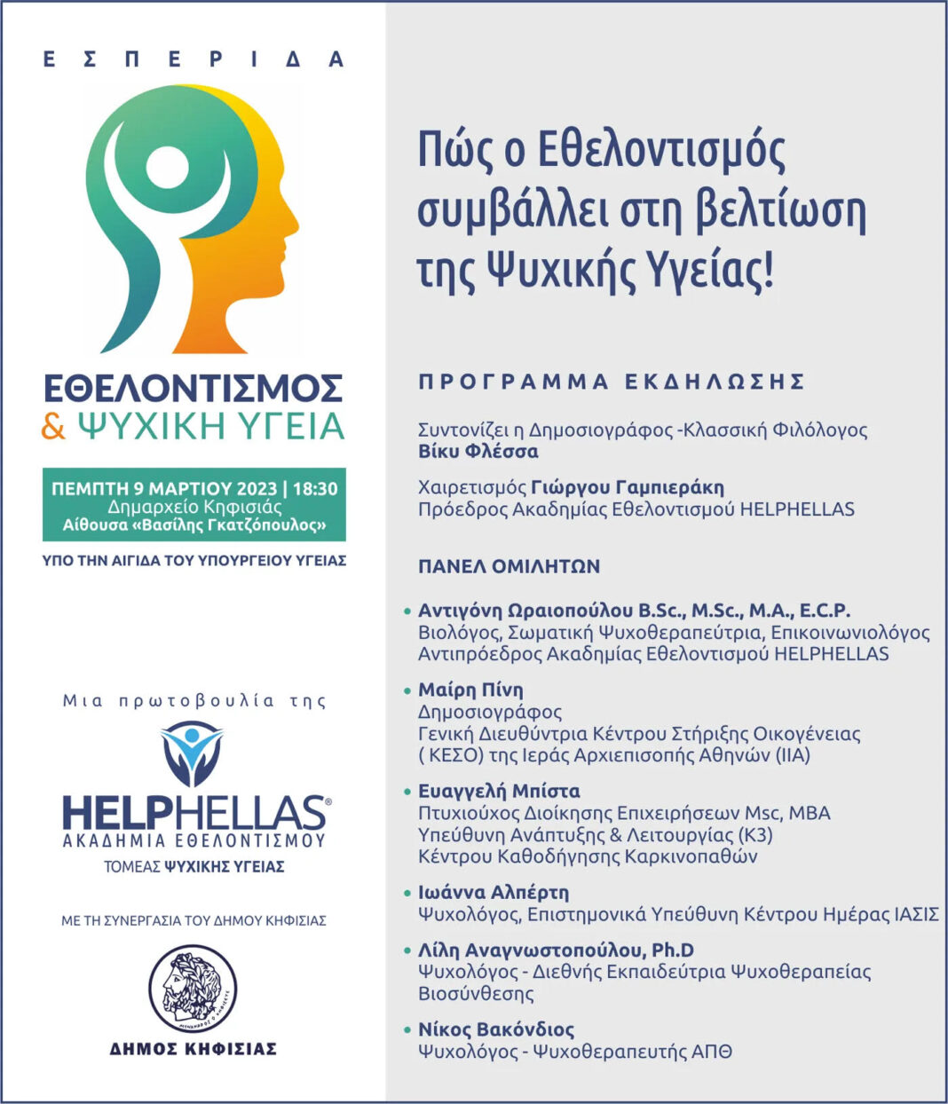 Ο Τομέας Ψυχικής Υγείας της Ακαδημίας Εθελοντισμού HELPHELLAS συνδιοργανώνει την Πέμπτη 9 Μαρτίου στις 18.30 με το Δήμο Κηφισιάς μια εσπερίδα με θέμα :