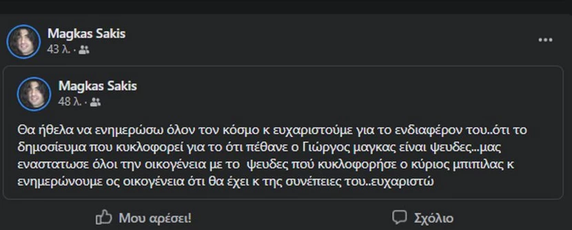«Θα ήθελα να ενημερώσω όλον τον κόσμο κ ευχαριστούμε για το ενδιαφέρον του..ότι το δημοσίευμα που κυκλοφορεί για το ότι πέθανε ο Γιώργος Μάγκας είναι ψευδές…μας αναστάτωσε όλη την οικογένεια με το ψευδές πού κυκλοφόρησε ο κύριος Μπιμπίλας κ ενημερώνουμε ως οικογένεια ότι θα έχει κ τις συνέπειες του..ευχαριστώ» έγραψε ο Σάκης Μάγκας.
