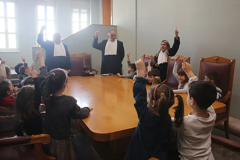 Για πρώτη φορά στη χώρα μας πραγματοποιήθηκε μία εικονική δίκη, στην οποία δικαστές είναι μπόμπιρες νηπιαγωγείο και συντελεστές (πρόεδρος, εισαγγελέας, κατηγορούμενοι, μάρτυρες, κ.λπ.) οι δικαστές του Συμβουλίου της Επικρατείας, ενώ στο «εδώλιο» του κατηγορουμένου, κάθεται η δασκάλα των παιδιών.