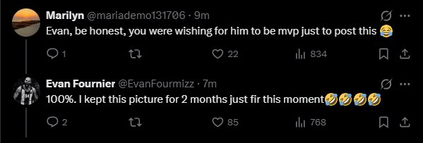 Μάλιστα, απαντώντας σε ένα σχόλιο χρήστη του X, ο Γάλλος δήλωσε πως «φύλαγε» την εν λόγω φωτογραφία για δύο μήνες και περίμενε τη στιγμή που ο Βεζένκοφ θα έβγαινε MVP για να την αναρτήσει!