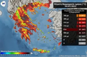 Σύμφωνα με τα έως τώρα διαθέσιμα προγνωστικά στοιχεία, παρόλο που αναμένεται μικρή πτώση της θερμοκρασίας από την Τρίτη (26-7-22) στα ανατολικά ηπειρωτικά, οι μέγιστες καθώς και οι ελάχιστες τιμές της θερμοκρασίας στις πεδινές περιοχές της κεντρικής Μακεδονίας, της Θεσσαλίας και της Στερεάς θα διατηρηθούν έως και την Πέμπτη (28-7-22) σε υψηλά επίπεδα.