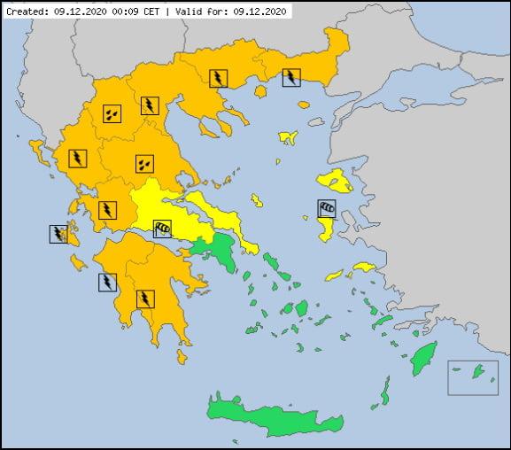 Την Τετάρτη (9/12) εκτός από τις προαναφερθείσες περιοχές, από τις μεσημβρινές ώρες θα επηρεαστούν επίσης η κεντρική Στερεά, η Θεσσαλία, οι Σποράδες, σταδιακά η δυτική Πελοπόννησος, η κεντρική Μακεδονία και από τις βραδινές ώρες η ανατολική Μακεδονία και η Θράκη.