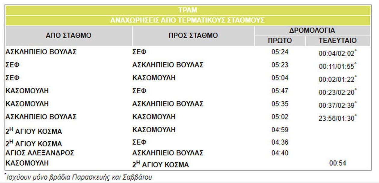 Τα τελευταία δρομολόγια στις γραμμές 2 και 3 θα αναχωρούν πλέον στις 00.20, ενώ οι επιβάτες πρέπει να θυμούνται ότι όσον αφορά το τραμ, λειτουργεί μόνο η γραμμή Βούλα – Κασομούλη.