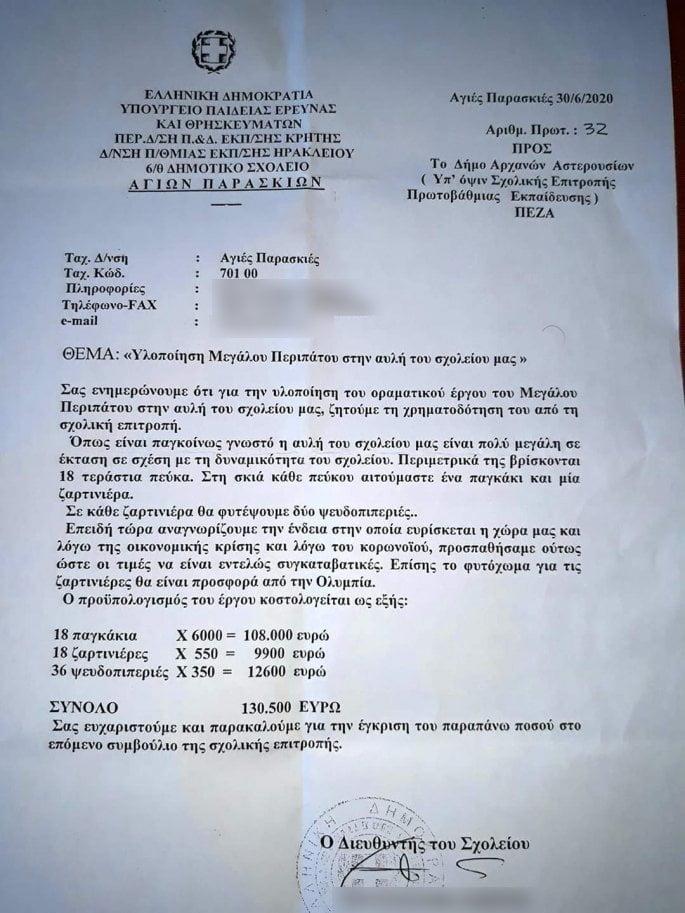 ας ευχαριστούμε και παρακαλούμε για την έγκριση του παραπάνω ποσού στο επόμενο συμβούλιο της σχολικής επιτροπής» καταλήγει η επιστολή.