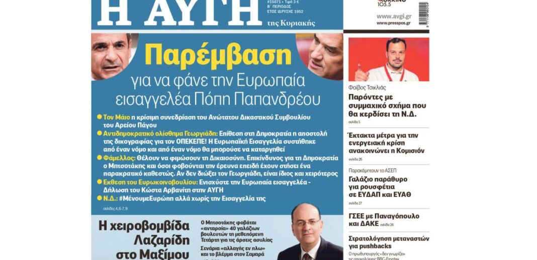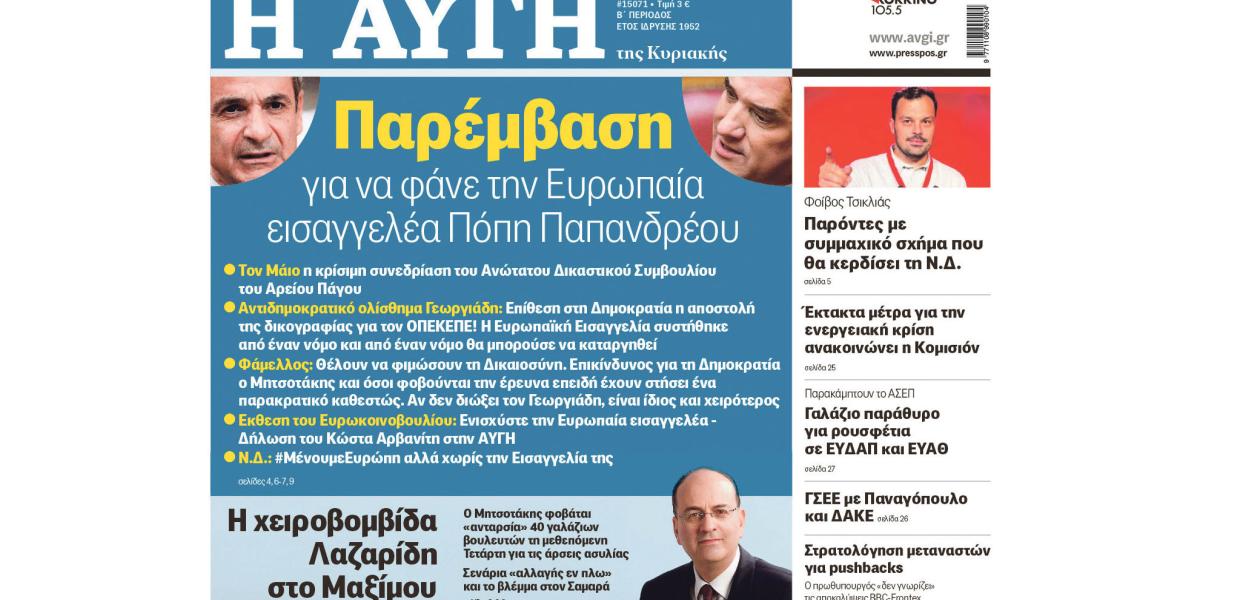 Η κυκλοφορία της εφημερίδας «ΑΥΓΗ» την Κυριακή 19 Απριλίου έφερε στο επίκεντρο ένα από τα πιο καίρια πολιτικά μέτωπα των ημερών, εστιάζοντας στις σφοδρές επιθέσεις που εξαπολύει η κυβέρνηση Μητσοτάκη-Γεωργιάδη εναντίον της Ευρωπαίας Εισαγγελέως. Το δημοσίευμα αναδεικνύει τις προσπάθειες του κυβερνητικού επιτελείου να υπονομεύσει το έργο της, θέτοντας ερωτήματα για την ουδετερότητα και την ανεξαρτησία των θεσμών στην προάσπιση της διαφάνειας και την πάταξη της διαφθοράς. Στο πλαίσιο αυτό, η εφημερίδα κάνει ειδική μνεία στην αδιαλλαξία και την αποφασιστικότητα που επιδεικνύει ο Φώτης Φάμελλος, ο οποίος, με την δική του παρέμβαση, απαντά στις κατηγορίες και υπερασπίζεται με σθένος το δικαίωμα για ανεξάρτητη διερεύνηση. Η τοποθέτησή του έρχεται ως απάντησε στις συνεχείς προσπάθειες να αμφισβητηθεί η νομιμότητα και η σκοπιμότητα των ενεργειών της Ευρωπαίας Εισαγγελίας, θέτοντας ουσιαστικά ένα θέμα σεβασμού των θεσμών και της ευρωπαϊκής νομοθεσίας.