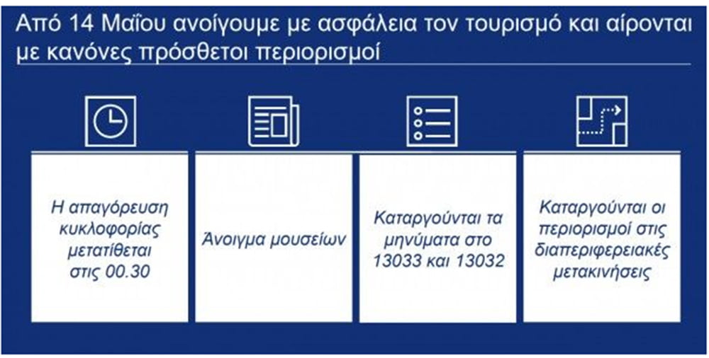 Καταργείται το γραπτό μήνυμα στο SMS 13033 & 13032, η κυκλοφορίας θα σταματάει στις 00:30, ενώ απελευθερώνονται οι μετακινήσεις απο νομό σε νομό.