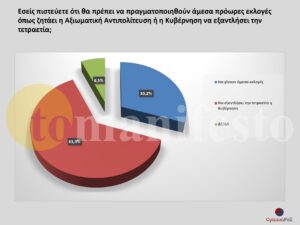 Αξιοσημείωτο είναι πως τα προβλήματα που εμφανίζονται δεν επιδρούν στο επίπεδο του αιτήματος της Αξιωματικής Αντιπολίτευσης για πρόωρες εκλογές. Το 63% ζητά να εξαντληθεί από την Κυβέρνηση η τετραετία.
