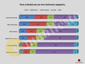 Στη δημοφιλία, ο Κυριάκος Μητσοτάκης εμφανίζεται πρώτος με 48.6% , ενώ δεύτερος πολύ κοντά βρίσκεται ο Νίκος Ανδρουλάκης με 47.1%. Ακολουθούν ο Α. Τσίπρας με 30%, ο Δ. Κουτσούμπας 29.5%, ο Γ. Βαρουφάκης με 19.6% και ο Κ. Βελόπουλος με 18.8% .