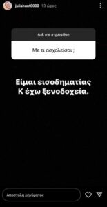 Όπως ενημέρωσε η ίδια μέσω απαντήσεων σε story στο Instagram ασχολείται επαγγελματικά με τους χώρους διαμονής. Πιο συγκεκριμένα, απάντησε ότι είναι εισοδηματίας και διαθέτει ξενοδοχεία.