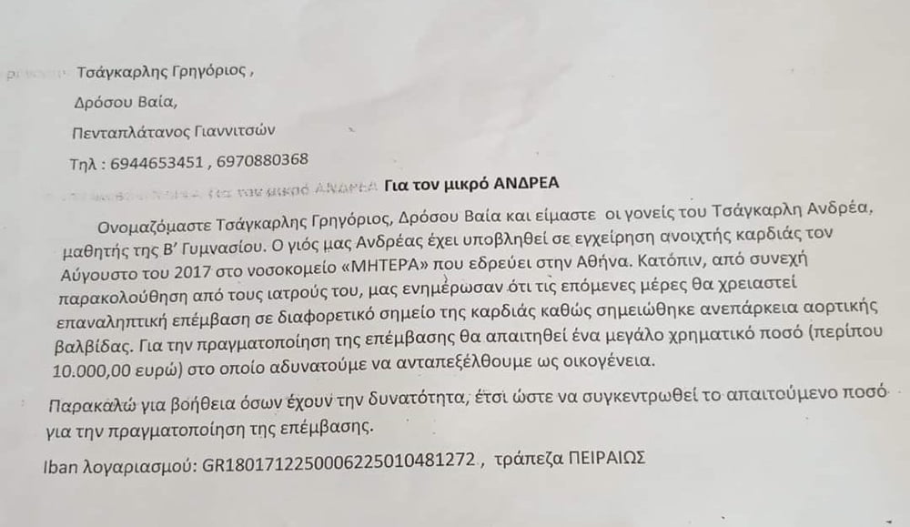 Το ποσό – στόχος, είναι τα 10.000 ευρώ, ώστε ο μικρός Ανδρέας να εγχειριστεί στο νοσοκομείο ΙΑΣΩ.