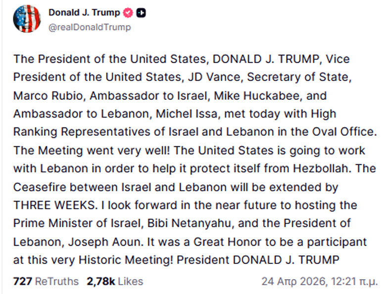 «Η κατάπαυση του πυρός μεταξύ του Ισραήλ και του Λιβάνου θα παραταθεί για τρεις εβδομάδες», ανέφερε ο Αμερικανός πρόεδρος μέσω Truth Social μετά τις συνομιλίες αντιπροσώπων της ισραηλινής και της λιβανικής κυβέρνησης, στις οποίες συμμετείχε, στον Λευκό Οίκο.
