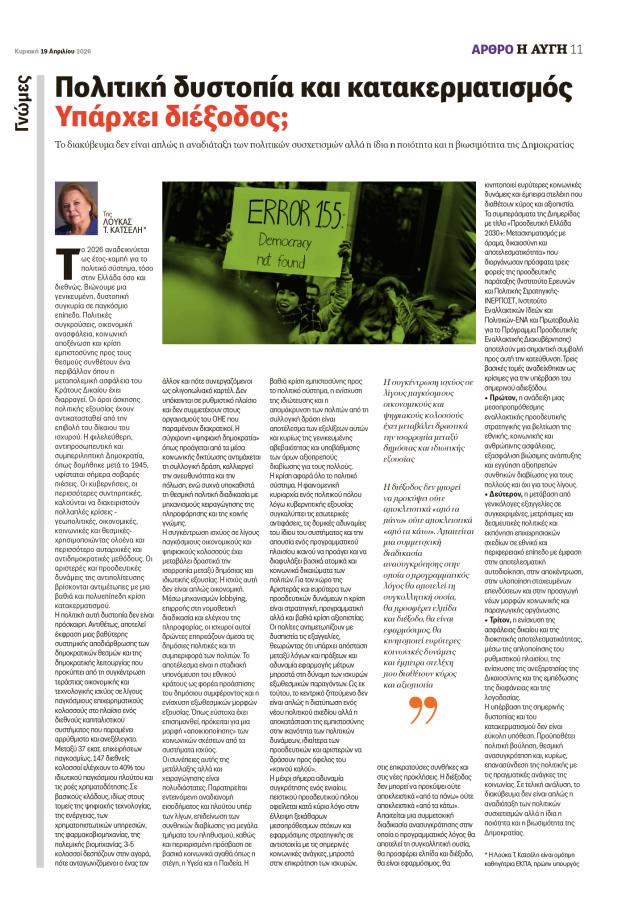 Η υπέρβαση της σημερινής δυστοπίας και του κατακερματισμού δεν είναι εύκολη υπόθεση. Προϋποθέτει πολιτική βούληση, θεσμική ανασυγκρότηση και, κυρίως, επανασύνδεση της πολιτικής με τις πραγματικές ανάγκες της κοινωνίας. Σε τελική ανάλυση, το διακύβευμα δεν είναι απλώς η αναδιάταξη των πολιτικών συσχετισμών αλλά η ίδια η ποιότητα και η βιωσιμότητα της Δημοκρατίας.