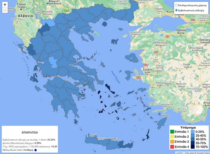 O χάρτης όπως αποτυπώνεται σήμερα, ενώ η δεύτερη εικόνα με τη χώρα στις αποχρώσεις του μπλε αφορά την εκδοχή για την εμβολιαστική κάλυψη: