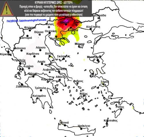 «Λίγο Προσοχη φίλες και φίλοι τις επόμενες ώρες κυρίως στην ανατολική Μακεδονία και τη δυτική Θράκη (Νομοί Σερρων, Δράμας, Καβάλας και Ξάνθης) είναι οι περιοχές οπου οι βροχές – καταιγίδες δεν αποκλείεται να έχουν εκτός από διάρκεια και αξιοσημείωτη ραγδαιότητα αυξάνοντας τον κίνδυνο τοπικών πλημμυρών! (οσο πιο πορφυρά τα χρώματα τόσο μεγαλύτερη η πιθανότητα- δείτε τον χάρτη) Με εκτίμηση Σάκης Αρναούτογλου»