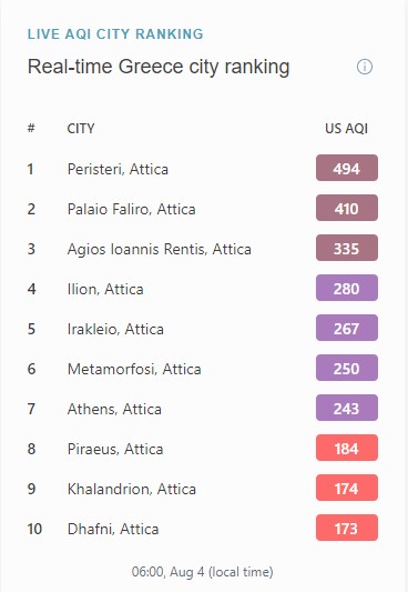 Το iqair.com μάλιστα έχει και μία λίστα με τις 10 περιοχές της Αττικής που έχουν τον πιο μολυσμένο αέρα, με το Περιστέρι να είναι στην κορυφή και να το ακολουθούν Παλαίο Φάληρο και Ρέντης.