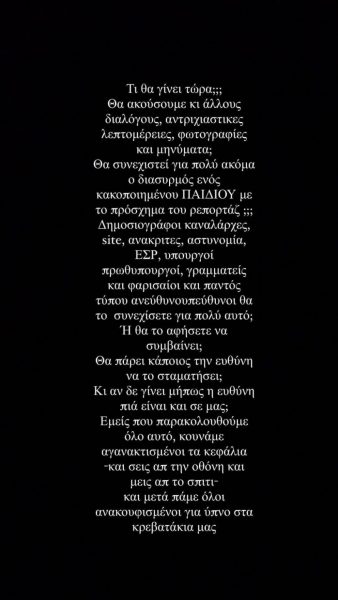 » Θα ακούσουμε κι άλλους διαλόγους, ανατριχιαστικές λεπτομέρειες, φωτογραφίες και μηνύματα; Θα συνεχιστεί για πολύ ακόμα ο διασυρμός ενός κακοποιημένου παιδιού με το πρόσχημα του ρεπορτάζ; Δημοσιογράφοι, καναλάρχες, site, ανακριτές, αστυνομία, ΕΣΡ, υπουργοί, πρωθυπουργοί, γραμματείς και φαρισαίοι και παντός τύπου ανεύθυνοι-υπεύθυνοι θα το συνεχίσετε για πολύ αυτό;