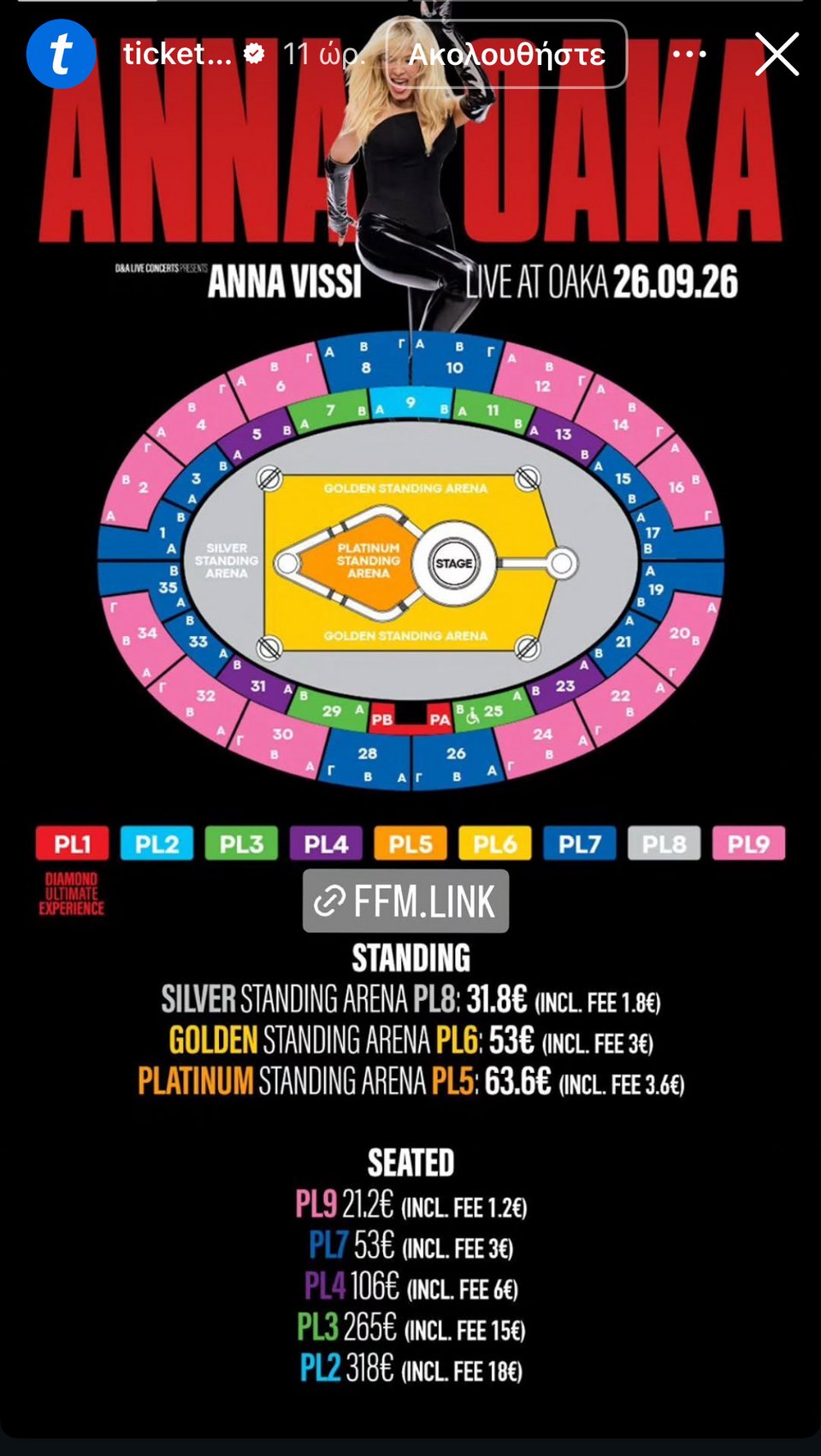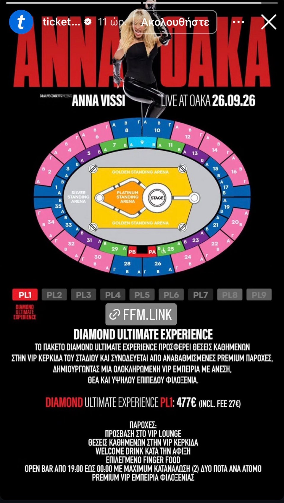 Από την άλλη, όσοι επιθυμούν να ζήσουν την απόλυτη εμπειρία στη συναυλία της… απόλυτης Άννας Βίσση μπορούν να επιλέξουν το diamond ultimate experience που αγγίζει τα 477 ευρώ. Το εισιτήριο αυτό περιλαμβάνει μεταξύ άλλων vip lounge, welcome drink, open bar και premium vip εμπειρία φιλοξενίας.