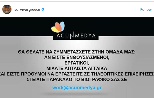 H εταιρία παραγωγής των επιτυχημένων τηλεοπτικών show ΤheVoiceofGreece και Survivor, τα οποία προβάλλονται από τον τηλεοπτικό σταθμό Σκαι, αναζητά άτομα που επιθυμούν να ενταχθούν στο δυναμικό της