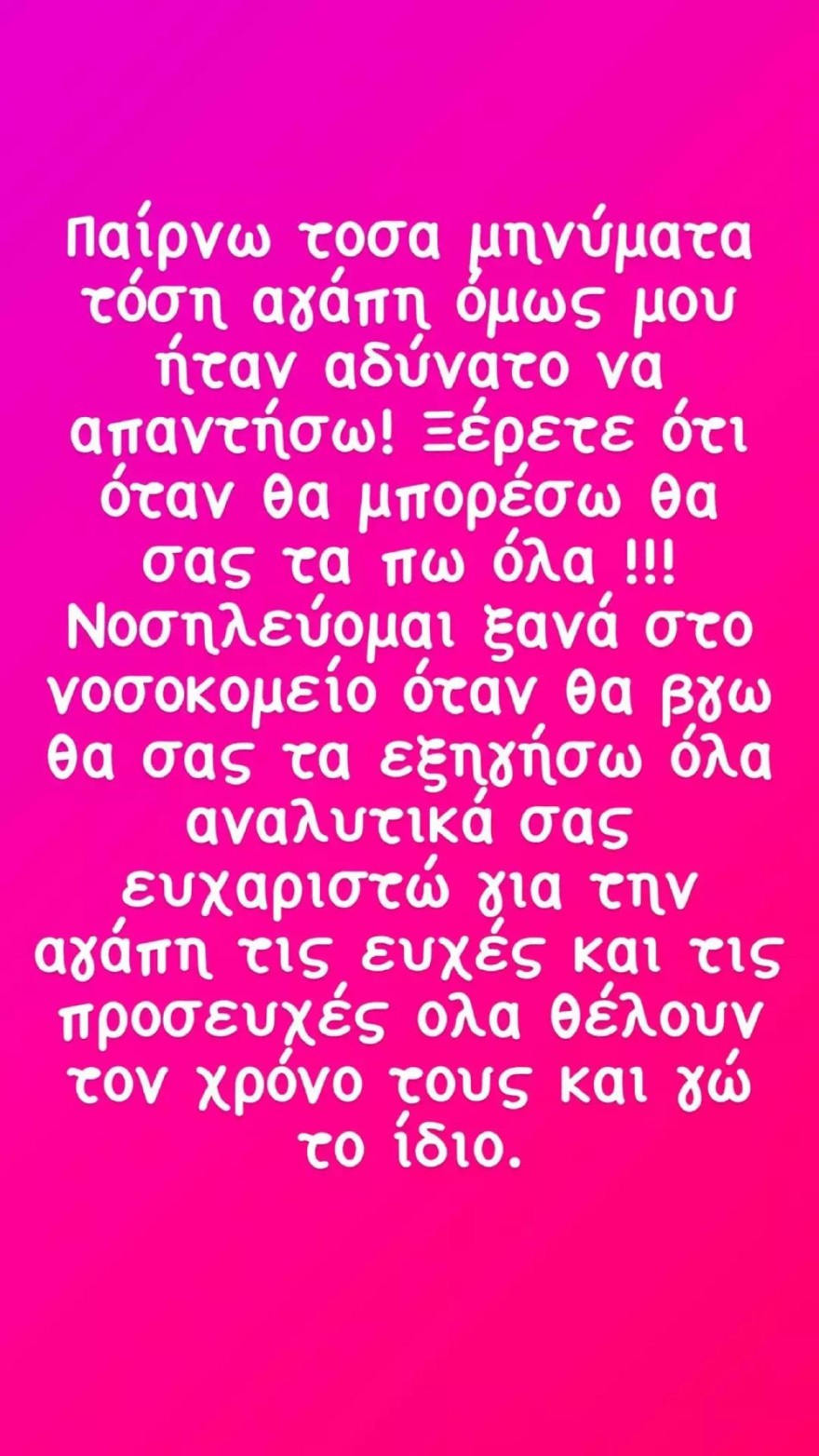 Νοσηλεύομαι ξανά στο νοσοκομείο, όταν θα βγω θα σας τα εξηγήσω όλα αναλυτικά, σας ευχαριστώ για την αγάπη, τις ευχές και τις προσευχές όλα θέλουν τον χρόνο τους και εγώ το ίδιο».