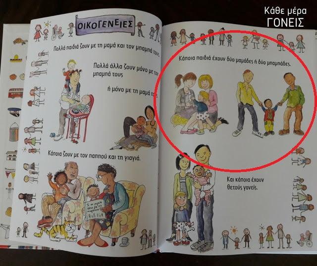 Το εικονογραφημένο βιβλίο, στην προσπάθεια του να μας παρουσιάσει τις διάφορες μορφές οικογένειας, αναφέρει ότι: κάποια παιδιά έχουν δύο μαμάδες και δύο μπαμπάδες.